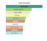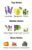 نت های بالای این ادو تویلت به ترتیب اسطوخودوس، ترنج و مورد سبز؛ نت های میانی مریم گلی، گل بنفشه و یاس و نت های پایه ای عنبر و چوب صندل می باشد.