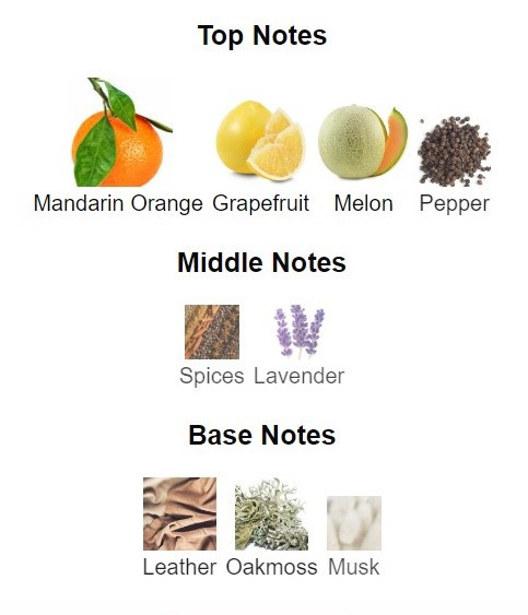 نت های بالایی این ادوتویلت نارنگی ماندارین، گریپ فروت ، فلفل ، خربزه و نت های میانی شامل اسطوخودوس ، ادویه جات معطر و در انتها نت های پایه مشک، خزه درخت بلوط و چرم می باشد.
